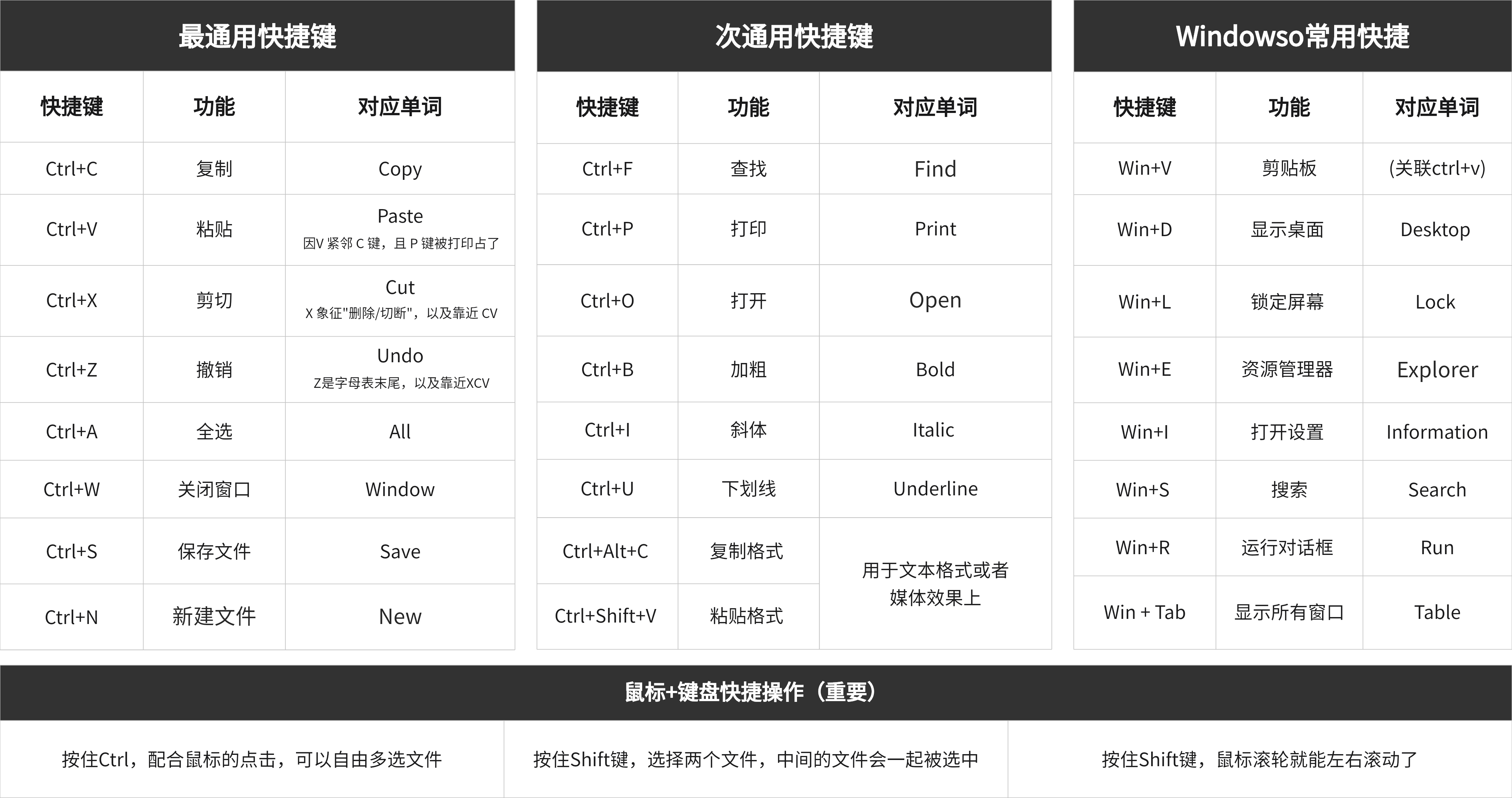 当鼠标移动到功能上的时候,基本都会有显示对应的快捷键,特别是一些专业软件上、以及windows电脑上的各个操作,再掌握了上面的通用快捷键后,加上有意识地觉察自己鼠标经常点的操作有那些然后开始使用快捷键来代替操作,整个体验感就会上去了,可以极大的提高效率,可能前期需要有意识的培养下使用习惯,但是一旦养成,将会一直受益