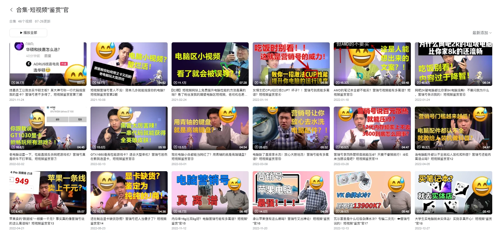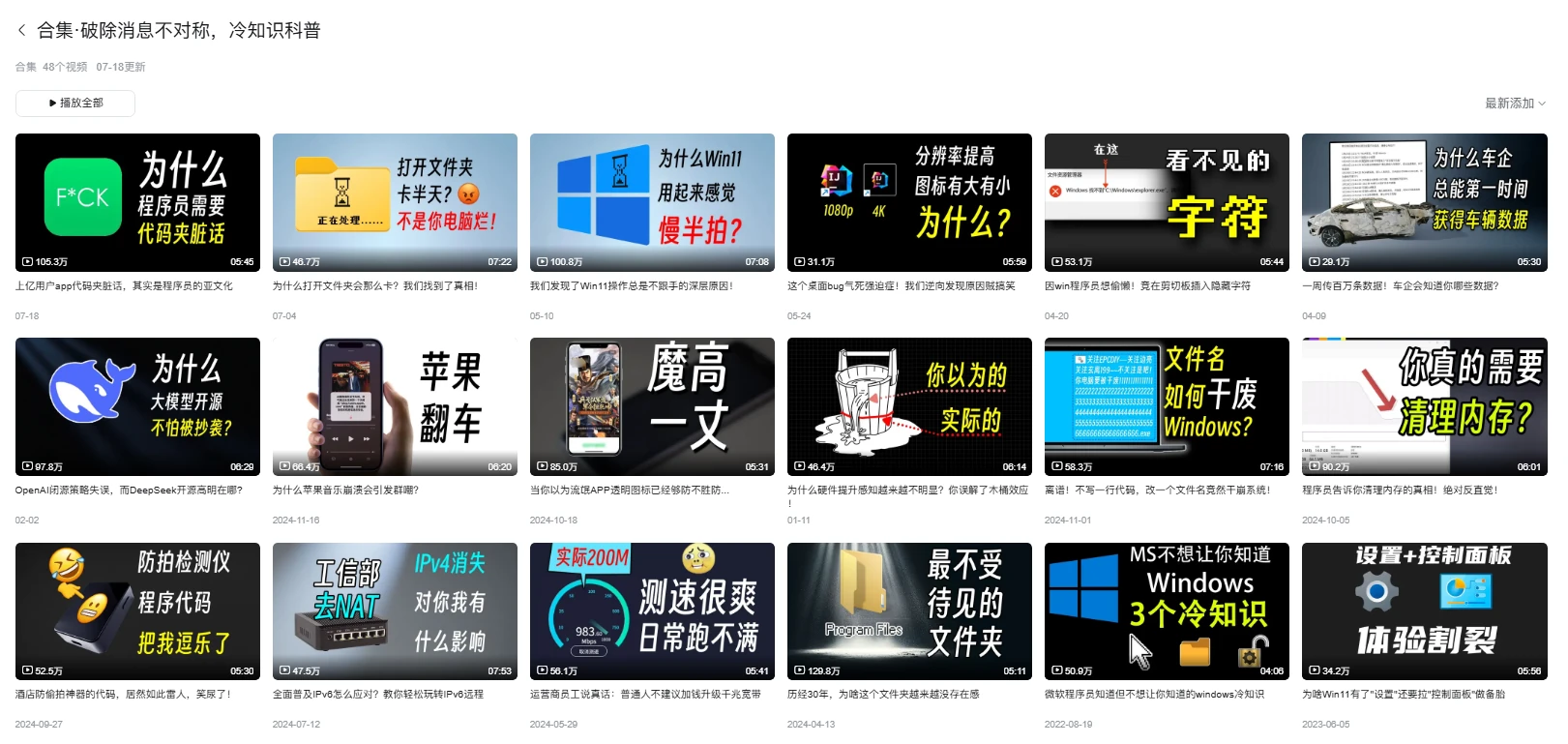 通过观看互联网那些电脑误导教学来进行科普,例如,一行代码系列,然后动不动的 win+r 系列,这两个系列也是它视频里的常客了,在图一乐的同时还可以学知识,并且也还有涉及到小白买电脑之类的,笔记本电脑的一些问题