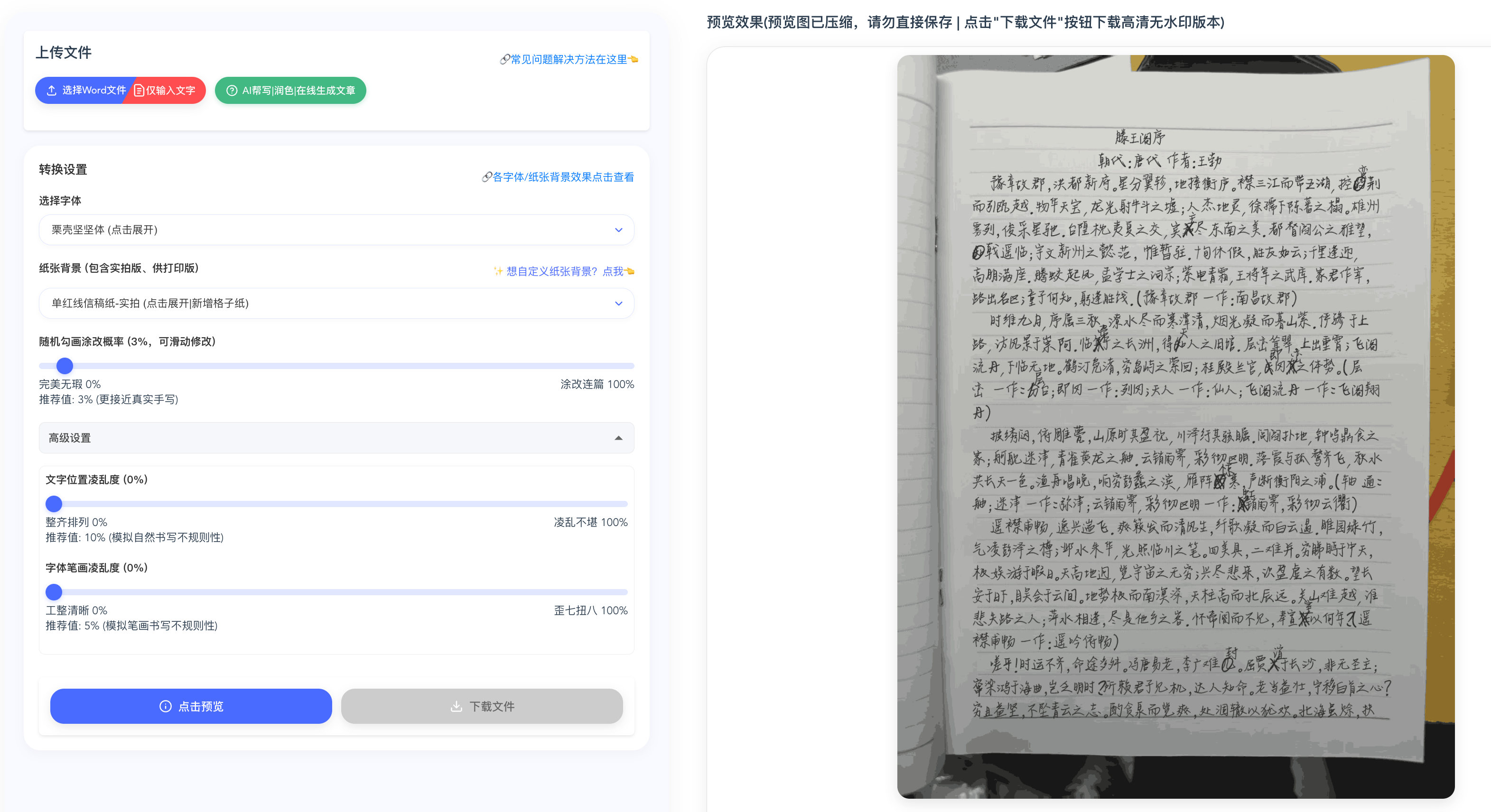 模拟手写样式 首页/工具/文档类 工具 文档类 2月17日 编辑 凹凸工坊 简述: 提供多种手写字体选择(20+种字体),支持中英日韩等多语言,纸张背景选项齐全 可调节涂改概率、文字凌乱度、笔画凌乱度等参数,模拟真实手写效果 点击进入